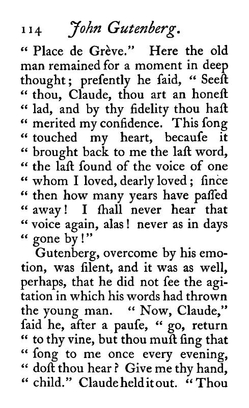 John Gutenberg was silent. Again he pressed to his heart the son of Gisquette, that son whom he had just found. Claude had but little to add to complete his father’s story.136 He told him of the sorrowful life led by Gisquette, of her unbroken faith to him, and how on her death-bed it had been her consolation to bequeath Claude as a last pledge of affection to her absent friend.