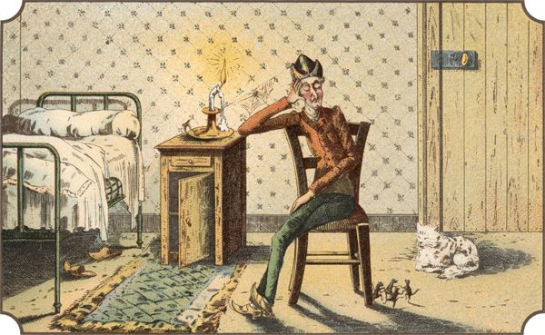 Après avoir fait en gémissant ses paquets, Papavoine s'endort, sans avoir le courage de se mettre au lit.—Plein d'une tendre sympathie pour les chagrins de son maître, le chat s'endort aussi.