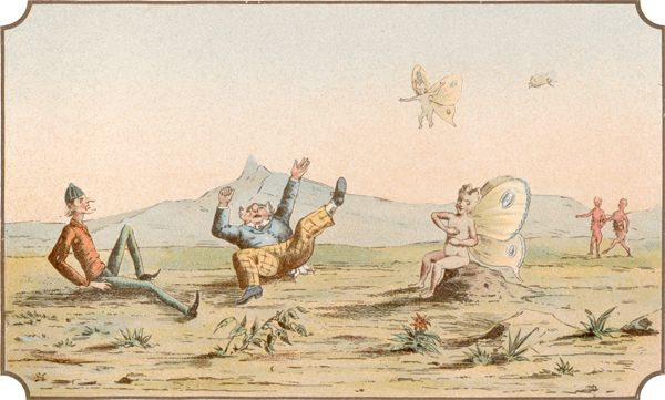 En sa qualité de Président de l'Académie des Sciences, Arts, Belles-Lettres de Fresney-le-Puceux, M. Baboulifiche devine que les édifices de forme pyramidale qu'ils entrevoient de tous côtés doivent être les habitations des gens de ce pays.—Remarquant en outre des arbres absolument inconnus pour eux et portant de gros œufs, ainsi que d'énormes chrysalides, le savant explorateur explique à Papavoine, qui n'ose guère en croire son maître ni ses yeux, que sans aucun doute les habitants de cette singulière contrée commencent par être des œufs, puis deviennent des chenilles, des chrysalides et se transforment enfin en magnifiques papillons.