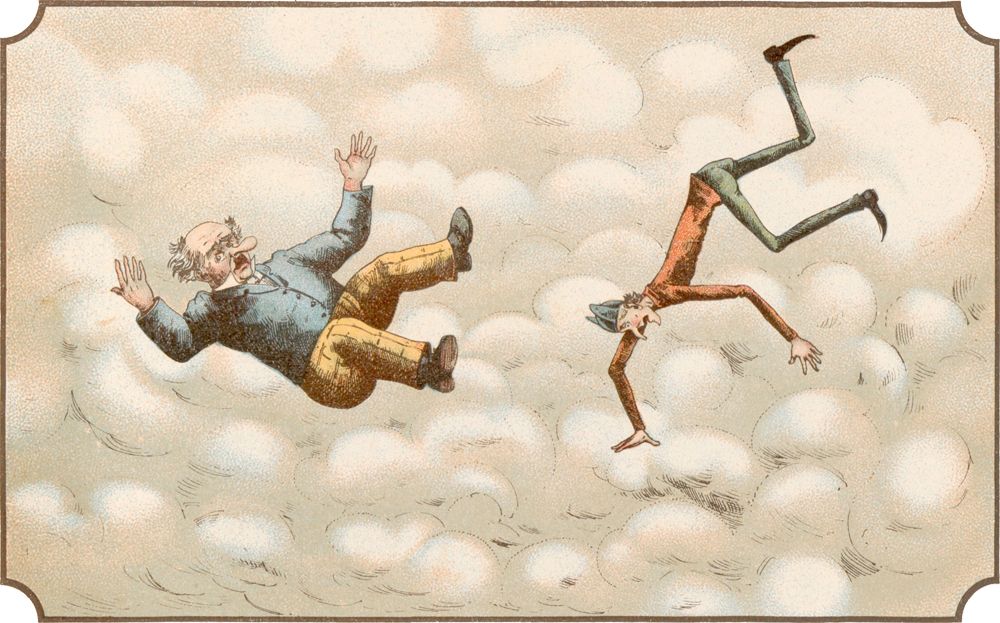 Les lanciers-voltigeurs ayant passé sans leur faire aucun mal, M. Baboulifiche et Papavoine se relèvent, prennent leurs jambes à leur cou et vont se réfugier dans une grotte voisine, où ils ne tardent pas à rencontrer des habitants à quatre pattes et à longues dents qui leur font encore une peur atroce.—Ne sachant comment échapper à ce nouveau danger, ils imaginent d'enfourcher d'énormes chauves-souris qui les entraînent hors de la grotte et s'envolent en les emportant sur le dos.