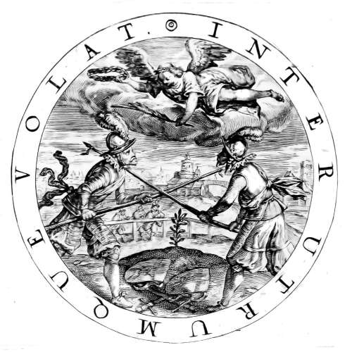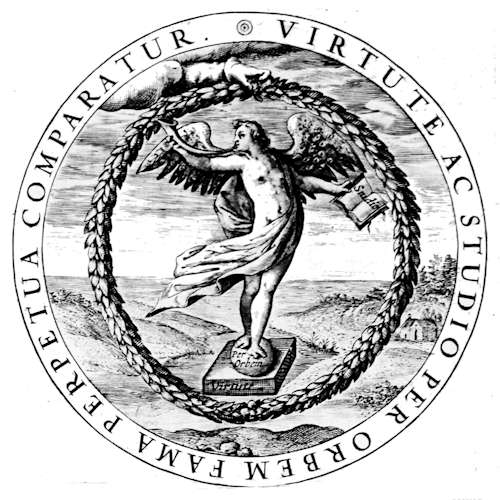 | Ill 12 Bk 3 | VIRTUTE AC STUDIO PER ORBEM FAMA PERPETUA COMPARATUR. Virtute ac studio per orbem fama perpetua comparatur By virtue and zeal everlasting worldwide fame is obtained |