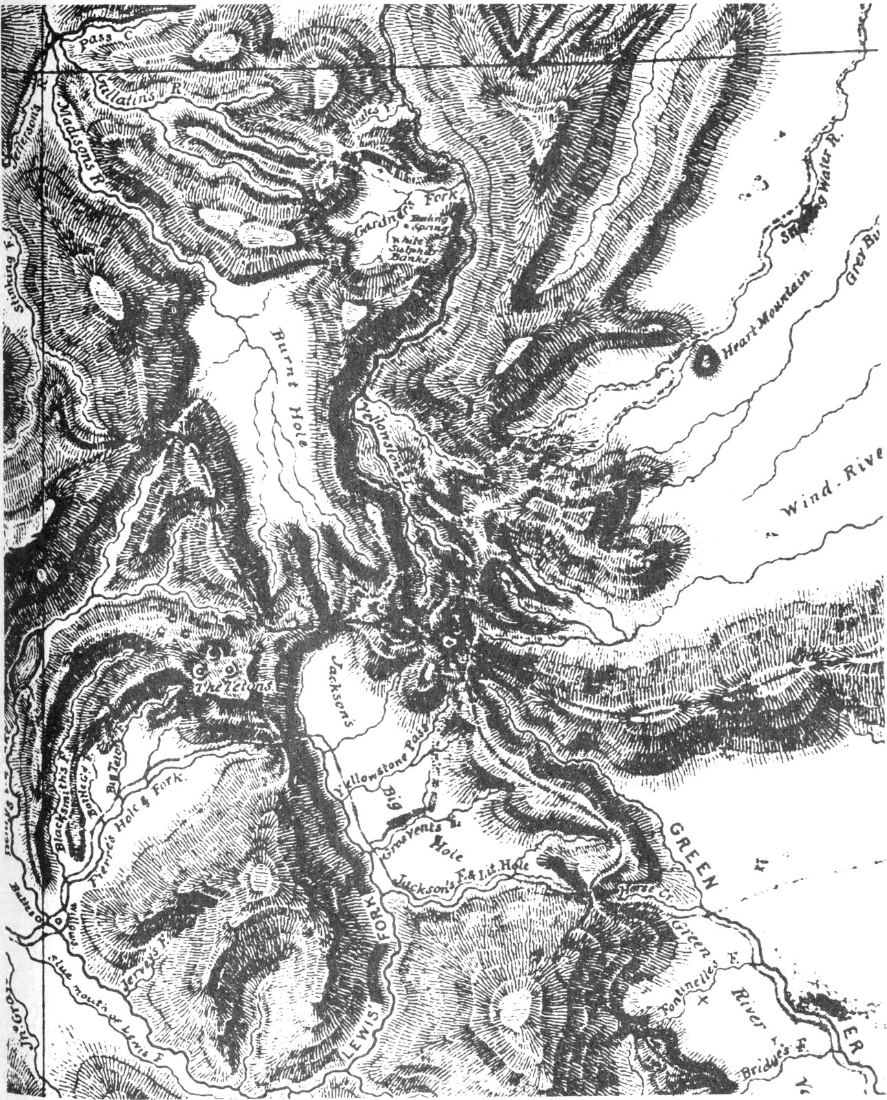 “Colter’s Hell”—bearing the name of the legendary discoverer, and conjuring up visions of a primitive “Dante’s Inferno”—is the term which visitors today associate with the early history of Yellowstone National Park and its universally famous hydrothermal wonders. Actually, the wandering, bearded, buck-skinned beaver trappers never referred to the geyser region of the upper Madison as Colter’s Hell. As we will see, the real Colter’s Hell in Jim Bridger’s day was another place altogether, having nothing to do with anything within Yellowstone Park itself. In trapper times the Yellowstone geyser area had no fixed name but was variously described by them as a region of “great volcanoes,” “boiling springs” or “spouting fountains.” On the recently discovered Hood and Ferris maps (see below) it is labeled “the Burnt Hole” (although this name seems to have been restricted by Russell and others to the Hebgen Lake Valley). Captain Bonneville tells us that his men knew of this region as “the Firehole” and this name, as applied to the river draining the geyser basins, survives today.