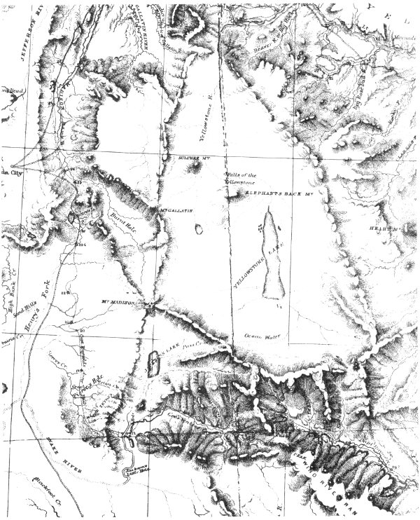 The final gesture of modesty may explain why this revealing map, prepared and made available to the government twenty years before the first official Park exploration got under way, was duly glanced at by the department authorities and then tucked away, a needle in the haystack of official files, in Washington, D. C., where it still reposes. It contains all the features of the “Bridger Map,” but with refinements. Here is a “Great Volcanic Region [?] now in a state of eruption,” drained by “Fire Hole Riv.” The lake now appear as “Yellowstone or Sublette’s Lake,” still oddly sausage-shaped. There is a “Little Falls” at the head of the canyon but the more impressive Lower Falls are 81 unexplainably omitted. To the southwest, in the position of present Shoshone Lake, is “De Smet Lake.” To the east at the forks of “Stinking Fr.” appears the “Sulphur Springs or Colter’s Hell Volcano” which, due to the unavailability of this map, has led so many historians astray. This map, with its manuscript forebears, ranks with the Ferris journal and map and the Potts letter as one of the principal historical documents pertaining to early Yellowstone.