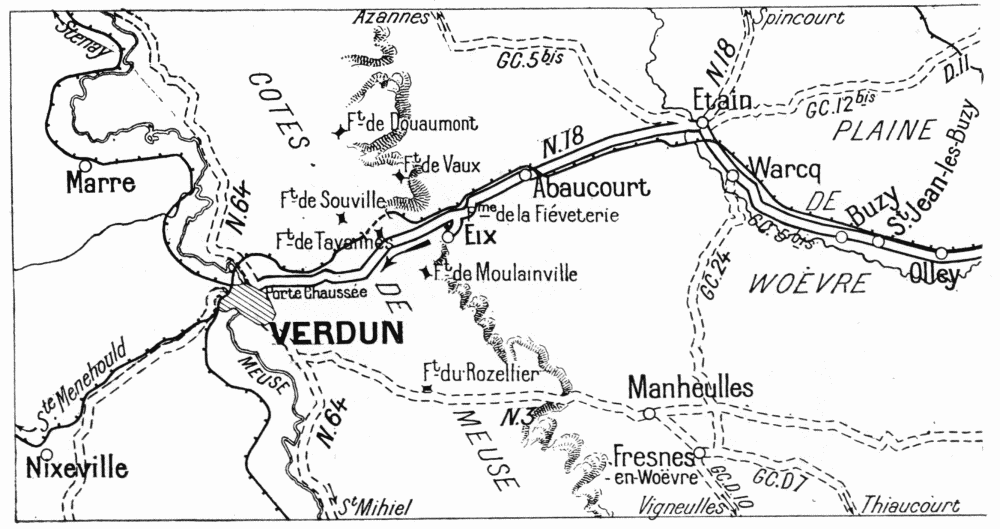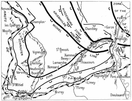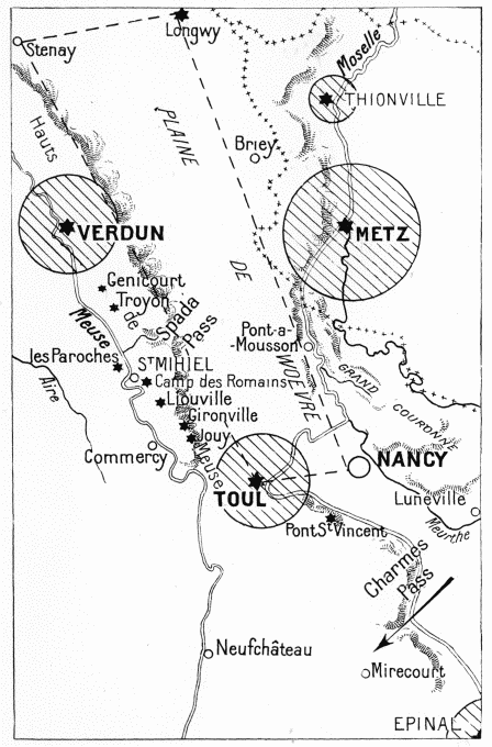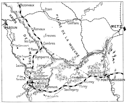 If we look at a map of the Franco-German frontier of 1914, between Nancy and Verdun, it will be seen that two rivers—the Meuse and the Moselle—ran parallel with the frontier, forming a double line of defences. The Moselle is protected by the hills of that name, and the Meuse by the Heights of Meuse, the eastern side of which, facing Germany, consists of a series of steep cliffs.