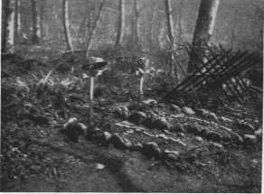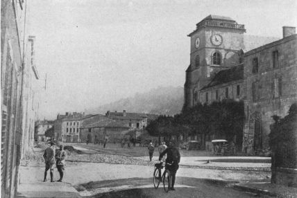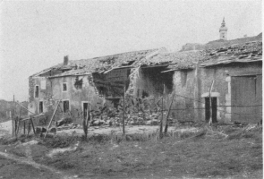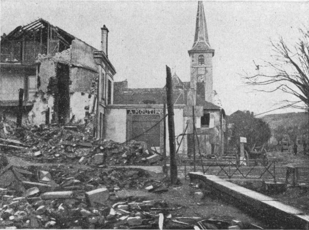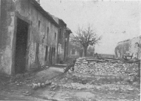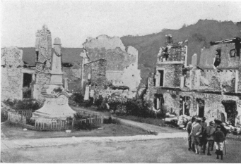 In the partly destroyed town, N. 18 is picked up again, which take to the left. The greatly damaged church (photos, pp. 141 and 142) is seen on the right. Its belfry was torn open by the bombardments, leaving visible the interior, where the Germans had installed an observation-post.
