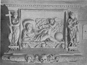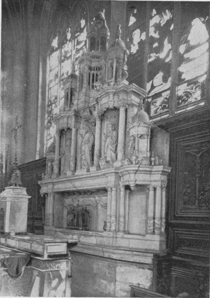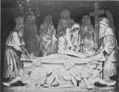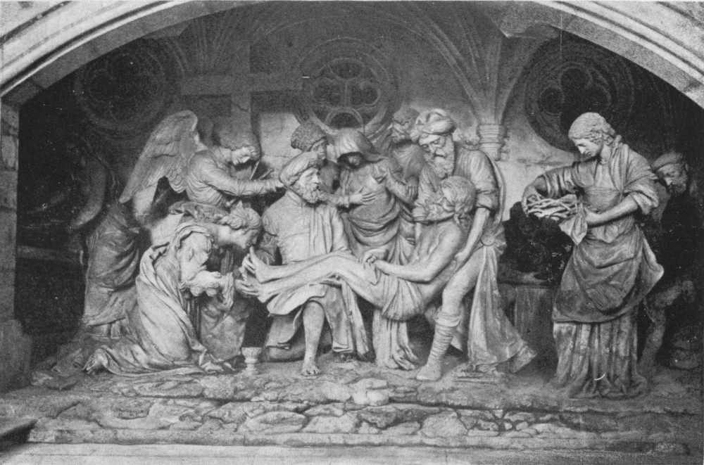 shaped like a mortar, but the epitaph round it proves its sacred origin. The Ligier Richier group (1528) represents the Virgin Mary gazing on the dead body of Christ. It differs slightly from that of Clermont-en-Argonne, attributed to the same sculptor.