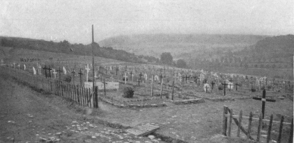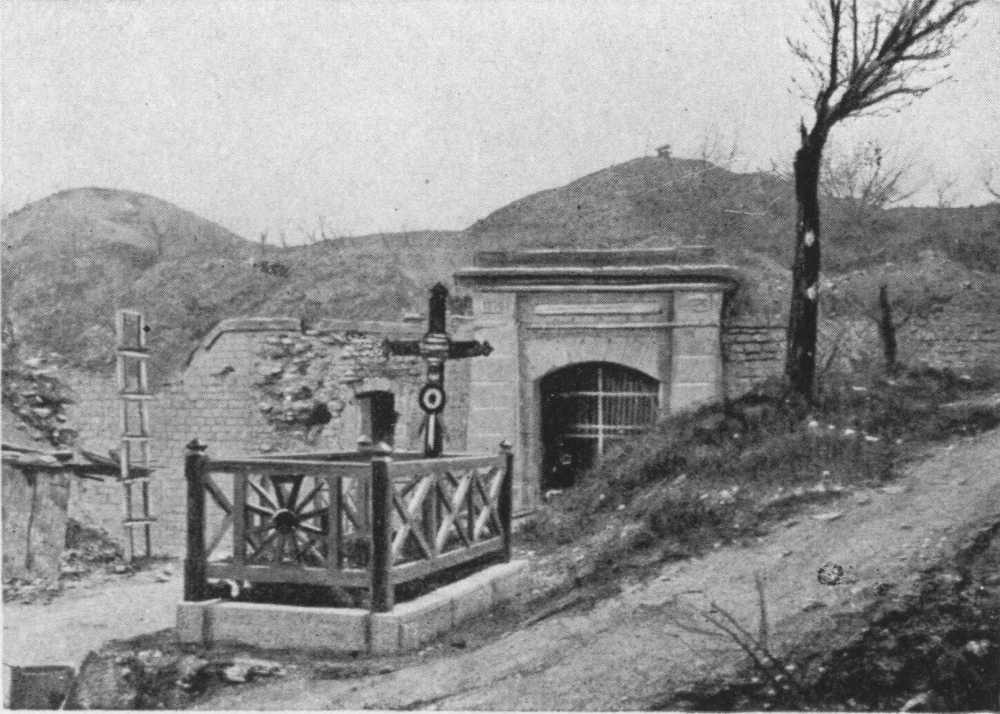 At the top of Hill 342, the road passes near Joan-of-Arc Fort, formerly the German fort “Kaiserin.” It stands about 300 yards to the right of the road. The latter, a little further on, turns sharply to the left near a monument surrounded with trees, which was erected to the memory of the soldiers who fell in 1870. Several graves bear the inscription: “Krieger v. 18 8-1870.”