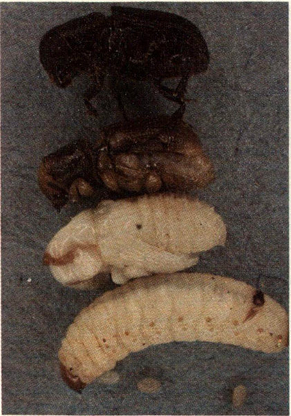 The adult beetles appear in midsummer. After feeding briefly on the tender bark of the terminals the adults descend to the bases of host trees where the female deposits her eggs in small pits gnawed in the bark. Eggs hatch in about three weeks. The larvae bore downward in the inner bark, entering a large root by fall. Larval feeding continues into the second year as the larvae bore into the inner bark and wood. The larvae transform into the non-feeding pupal stage and finally into an adult in the summer of the second year thus completing a two year life cycle. Adult beetles are 1¼ to 1½ inches long. They are black with lines of cream-colored scales forming irregular black patches.