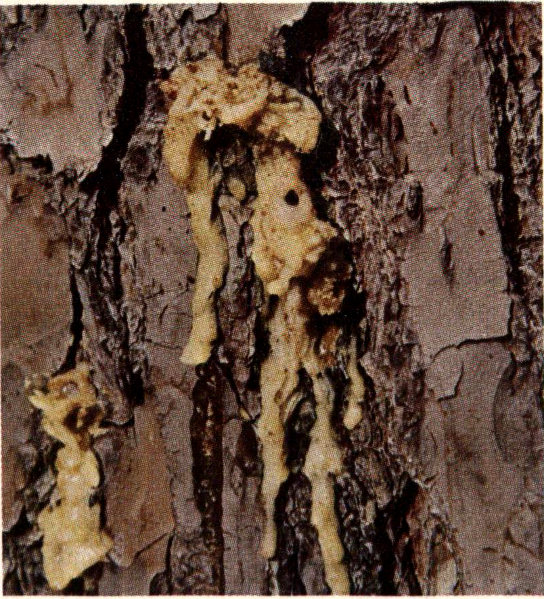 The fungus is spread by spores produced by honey-colored mushrooms, rhizomorphs, and root contacts between diseased trees or stumps and healthy trees. Rhizomorphs are visible strands of compacted mycelium (fungus material) that appear as black or reddish-brown “shoestrings.” They may be flattened when found between bark and wood or cylindrical when found in decayed wood or soil. Rhizomorphs increase in length at their tips and in this manner the fungus may move through the soil from infected trees to uninfected trees. The honey-colored mushrooms are produced annually and are fairly short lived; they are subject to desiccation, and are favored by small mammals. The size of the top varies from two to five inches in diameter. The top is usually flecked with dark brown scales. White to light yellow gills are borne underneath. Crown symptoms of the trees affected are similar to those caused by any malfunctioning of the roots. A reduction in size and production of leaves or needles, a general thinning of the crown, branch dying, and yellowing of foliage may precede death or trees may die rapidly with a rapid red discoloration of the foliage. Trees often die in groups, but single-tree kill is also common. Cankers bleeding resin, gum or other exudate at the tree base are common symptoms.