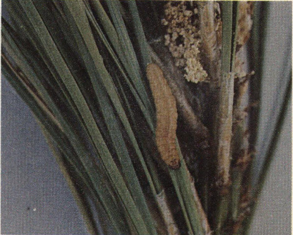 The female moth lays eggs on the upper surface of leaves along the mid-rib, singly or in groups of two to eight. Hatching occurs in about five days and the young larvae cover themselves with silk mixed with trash, and then tunnel into the mid-rib. After the first molt, larvae leave the tunnels and bore into tender shoots. Larvae reach maturity in about 21-23 days and begin moving down the trunk of the tree where they spin cocoons in sheltered bark crevices, in litter, or between leaf folds. The adult moths emerge in eight or nine days. It takes from 40-45 days to complete the life cycle in mid-summer.