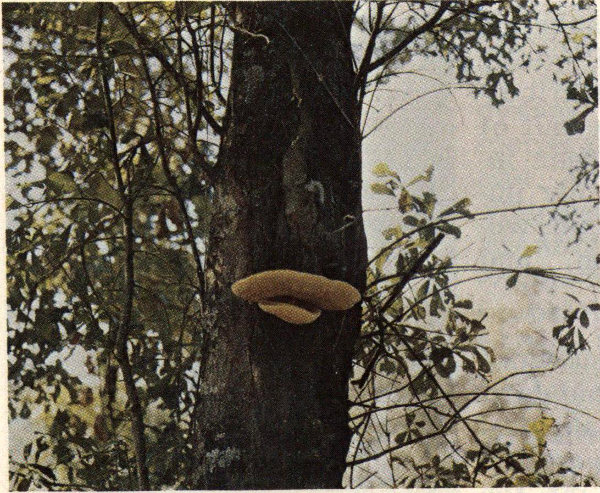 Irpex canker is also considered to be a canker-rot disease. Symptoms on infected trees frequently involve irregular cankers up to two feet in length. Cankers are usually found on trees eight to ten inches in diameter or larger, at a height of twenty feet above the ground. Branch stubs, signifying probable infection points, are usually present in the centers of cankers. The portion of the trunk affected is usually swollen but sometimes may be sunken. At the base of the sunken portion of the canker are small, creamy-white, toothed fruiting bodies or conks with a leathery texture. Conks also appear on hardwood logs. The wood behind cankers is characterized by a tough, spongy, white rot which extends as much as eight feet above and below the canker. The decay pattern may also extend downward into the roots. In cross-section, the rotted areas appear as finger-like projections radiating out toward the sapwood. Gradually the rot column tapers to a thin central core beyond which white flecks appear, and this early rot stage is concentrated along the rays of the oaks.