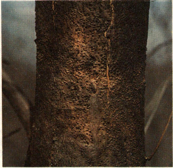 Young stem cankers usually develop around openings such as wounds, lenticels, or leaf scars, appearing first as sunken, dark areas of the bark. The infected area later becomes more depressed and darker as tissue dies, and often a black margin will be formed around the canker. Small, pink, hair-like spore tendrils are produced by the fungus around the canker margin, especially during moist weather. These tendrils contain spores which can cause further infection, and arise from small dark fungal fruiting structures called pycnidia. This cankered area is often invaded by insects and other fungi and is also a weakened area at which wind breakage may occur. The fungus also causes a gray to black leaf spot, which usually has a light colored center. These spots may coalesce on a severely infected leaf and involve the entire leaf surface. This leaf spot in itself causes slight damage, but acts as a source of fungus spores which can cause stem cankers, and thus is important in the overall consideration of the disease.