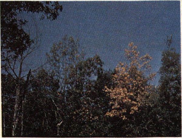 The earliest symptoms of the disease appear in the top of the crown, at the outer tips of the branches. Here the elm leaves suddenly wilt, turn yellow, the margins curl upward and the leaves die. Leaf-fall causes the crown to appear sparse. In large trees, the foliage symptoms may initially appear on one branch or only a portion of the crown. However, the symptoms during the advanced stage of the disease are exhibited throughout the crown. The most reliable symptom appears as a yellow to butterscotch discoloration on the inner bark surface or phloem. This symptom initially appears under the bark of large roots, later spreading to the base of the main stem and finally to the larger branches. Phloem and cambial discoloration is often found in advance of the foliage symptoms. The moderately discolored phlomen has a slight odor of wintergreen. Thus far, all trees known to be infected with the pathogen have died. Acutely infected trees, while initially appearing healthy, may wilt and die in three to four weeks.