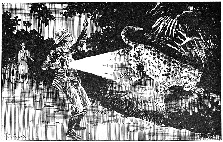 We were a sorry looking pair as we set out on the last short relay in India. The cooking pots which we carried clattered and rattled noisily as they banged against the frames of our bicycles. The luggage [106]cases were heavily laden; our front tires, long ago worn out as rear tires, leaked badly; the cork grips were gone from our handle-bars, and the felt pads of our saddles had become hard as wood. Our attire was thoroughly in keeping with the disreputable appearance of our wheels. Helmets were battered and patched, clothes torn and stained, shoes scuffed and cut to relieve swollen feet, and stockings darned with thread of all colors. Mrs. McIlrath, covered with prickly heat, looked as though bees had stung every portion of her hands and face, and I hardly recognized my own self in the mirror in the gaunt, hollow-cheeked, dull-eyed, yellow-skinned skeleton. Our objective point was Kurrachee. We had a good path, exceptionally free from culverts and bridges, and in the white light of the moon, fanned by the cool breeze from the sea, we sped merrily along until a low-railed bridge obstructed our path, a sign-board indicating that we were but four miles from Dabhugi, the village where we intended to eat our lunch. We were so close upon the bridge before dismounting, that to check my heavy-laden wheel I had to run a few steps with it. Bracing one foot against the curb of the bridge, my eye moved involuntarily to where my foot rested. I was having another encounter with a cobra. The black monster was stretched out in heavy line four feet long. He was of the hooded species, the most deadly of his family, and I stood face to face with death in his most terrible garb. I should have retreated, I should have shot the hideous thing, I should have done anything else but what I did, to stand terrified without power to move a muscle. Suddenly the snake coiled itself into a knot, then twisted around in a circle and disappeared in one of the crevices of the loose rock on the slope of the stream. It was one of the closest escapes I have to relate.