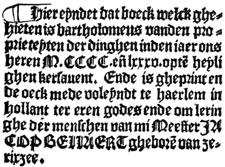 357 The colophon of this book is a queer piece of mysterious English: . . . Enprentyd in the duchye of Braband, in the town of Andewarpe, in the yere of our Lord M. CCCC. XCIIII. By maistir Gerard de Leew, a man of grete wysedom in all maner of kunyng: whych nowe is come from Lyfe unto the doth, which is grete harme for many of poure man. On whas sowle God almythy for hys hygh grace haue mercy. Amen. Van der Meersch. Imprimeurs Belges et Néerlandais, vol. I, p. 119.