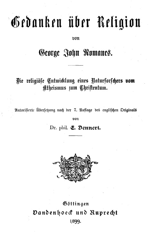 George John Romanes, der heimgegangene Verfasser von „Darwin und nach Darwin“, so wie von „Prüfung der Weismannschen Lehre“, nahm in den letzten Jahrzehnten eine hervorragende Stellung in der Biologie ein. Aber er beschäftigte sich auch unaufhörlich und je länger desto mehr mit den Problemen der Metaphysik und Theologie. Bei seinem im Frühsommer dieses Jahres (1894) erfolgten Tode hinterließ er unter seinen Papieren einige Notizen, welche zumeist im vorhergehenden Winter geschrieben und für ein Werk über die Grundfragen der Religion bestimmt waren. Er hatte angeordnet, daß diese Aufzeichnungen mir gegeben werden sollten, damit ich mit ihnen nach meinem Dafürhalten verführe.