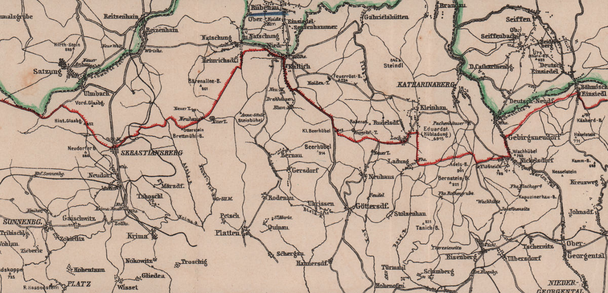 Seitentour: Nach Katharinaberg und zurück. Hinter dem »Grünen Baum« am Berg empor zum Kaiser Franz Josef-Aussichtsturm, herab in die altertümliche Bergstadt Katharinaberg (Hotel Kronprinz Rudolf, einfach, aber gut) (s. Berlet, Erzg. R. VII a) und nun auf derselben Straße bei genanntem Turme vorbei in südöstlicher Richtung (l. immer schöne Aussicht auf Gebirgsneudorf und Einsiedl) in 1 Stunde an das obere Ende von Gebirgsneudorf und nach Nickelsdorf, wo wir beim Hause Nr. 19 (Rasierstube) auf den Kammweg treffen und uns nach r. wenden.