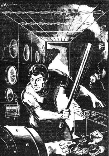 Rikud heard the throbbing again as he stood in the room of the machinery. For a long time he watched the wheels and cogs and gears spinning and humming. He watched for he knew not how long. And then he began to wonder. If he destroyed the wheels and the cogs and the gears, would the buzzer stop? It probably would, because, as Rikud saw it, he was clearly an "unauthorized person." He had heard the voice again upon entering the room.