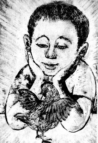 In an instant, the chicken was gone and Bonnie was back. She climbed down from the table, wiped her eyes and said, "It's a good thing you fixed me, boy. Would you ever have got it."