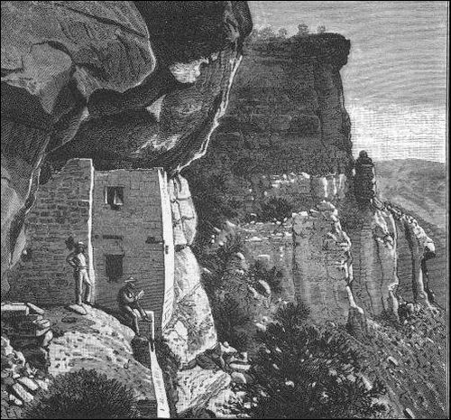 In a remote age the ancestors of these Pueblo tribes, or a race of kindred habits, filled most of that vast region which is drained by the Colorado River and its affluents, and spread beyond into the valley of the Rio Grande. The explorers of a great extent of country in Utah, Arizona, New Mexico and Colorado have found everywhere evidences of the wide distribution and wonderful industry of that ancient people. On the low land which they used to till lie the remains of their villages—rectangular buildings of enormous dimensions and large circular estufas, or halls for council and worship. On the sides of the savage cliffs that wall in or overarch the cañons are scattered in every crevice and wrinkle those strange and picturesque ruins which give us the name "Cliff-dwellers" to distinguish this long-forgotten people. And on commanding points, seen far away down the cañons or across the mesas, stand the solitary watch-towers where sentinels might signal to the villagers below on the approach of Northern barbarians.