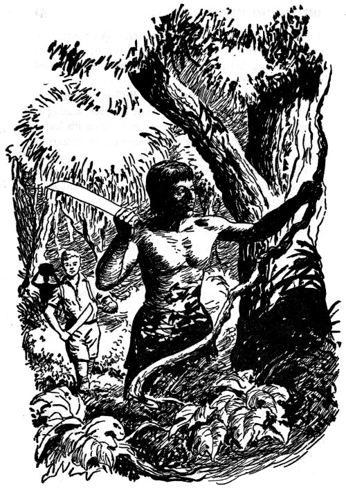 The Wai Wais had been stalking Urubu’s riflemen to the edge of the sandbank. The first blast of gunfire had given away the position of Urubu’s men. Now, the Wai Wais were engulfing them like a human tidal wave, while Biff and Kamuka resumed their battle with the rapids, keeping the big, clumsy boat clear of the rocks and sand.