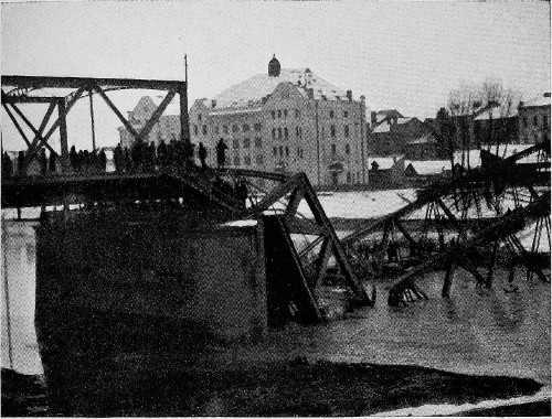 Przemysl itself is an extremely old town which I believe was for nearly 1,000 years a Russian city. From remote days of antiquity it has been a fortress, and following the ancient tradition, each successive generation has kept improving its defences until to-day it is in reality a modern stronghold. Why the Austrians have made this city, which in itself is of no great importance, the site of their strongest position, is not in the least obvious to the layman observer. The town itself, a mixture of quaint old buildings and comparatively modern structures, lies on the east bank of the river San—which at this point is about the size of the Bow river at Calgary, in Canada—and perhaps 3 kilometres above the point where the small stream of the Wiar comes in from the south. The little city is hardly visible until one is almost upon it, so well screened is it by rolling hills that lie all about it. Probably the prevailing impression in the world has been that the Russian great 21 guns have been dropping shells into the heart of the town; many people even in Lwow believe it to be in a half-ruined condition. As a matter of fact the nearest of the first line of forts is about 10 kilometres from the town itself, so that in the whole siege not a shell from the Russian batteries has fallen in the town itself. Probably none has actually fallen within 5 kilometres of the city. There was therefore no danger of the civilian population suffering anything from the bombardment while the outer line of forts held as they did from the beginning.