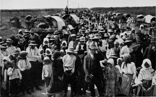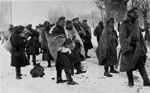 From Lwow almost due west runs the line of the highway to Grodek where we get our first 15 glimpse of prisoners in bulk. Here, at the scene of some of the fiercest fighting that the war has produced, is a rest station for the columns that are making the journey to Russian captivity on foot from Przemysl to Lwow, and I know not how far beyond. As we motor into the town the three battalions of the 9th Hungarian regiment of the 54th Landsturm brigade are just straggling into the town from the west. With a few Russians who seem to be acting as guides and nurses rather than as guards, they file through the streets and into a great square of a barracks. Here they are marshalled in columns of four, and marched past the door of the barracks where an official counts the individual fours and makes a note of the number that have passed his station. Beyond in a grove the ranks are broken, and the weary-looking men drop down under the trees, regardless of the snow and mud, and shift their burdens and gnaw at the hunks of bread and other provisions furnished them by the Russians.