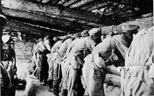 Just east of Sadowa Wisznia, the scene of another Austrian stand, we come upon a regiment 17 attached to the 54th Landsturm brigade. This is the tenth regiment, and, with the exception of a few non-commissioned officers, is composed entirely of Slovaks and Hungarians. They are resting as we motor up, and for nearly a mile they are sitting dejectedly by the side of the road, some with heads resting wearily against tree trunks, while dozens of others are lying in the snow and mud apparently asleep. As nearly as I could estimate, there is about one Russian to a hundred prisoners. In any case one has to look about sharply to see the guards at all. It reminds one a bit of trying to pick a queen bee out of a swarm of workers. Usually one discovers the guard sitting with a group of prisoners, talking genially, his rifle leaning against the trunk of a tree near by.