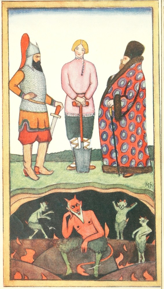 “There are three brothers,” he said, “Simon the Warrior, Taras the Pot-bellied, and Ivan the Fool. I want them all to quarrel and they live in peace and goodwill. It is the Fool’s fault. Go to these three brothers, the three of you, and confound them so that they will scratch out each others’ eyes. Do you think you can do it?”