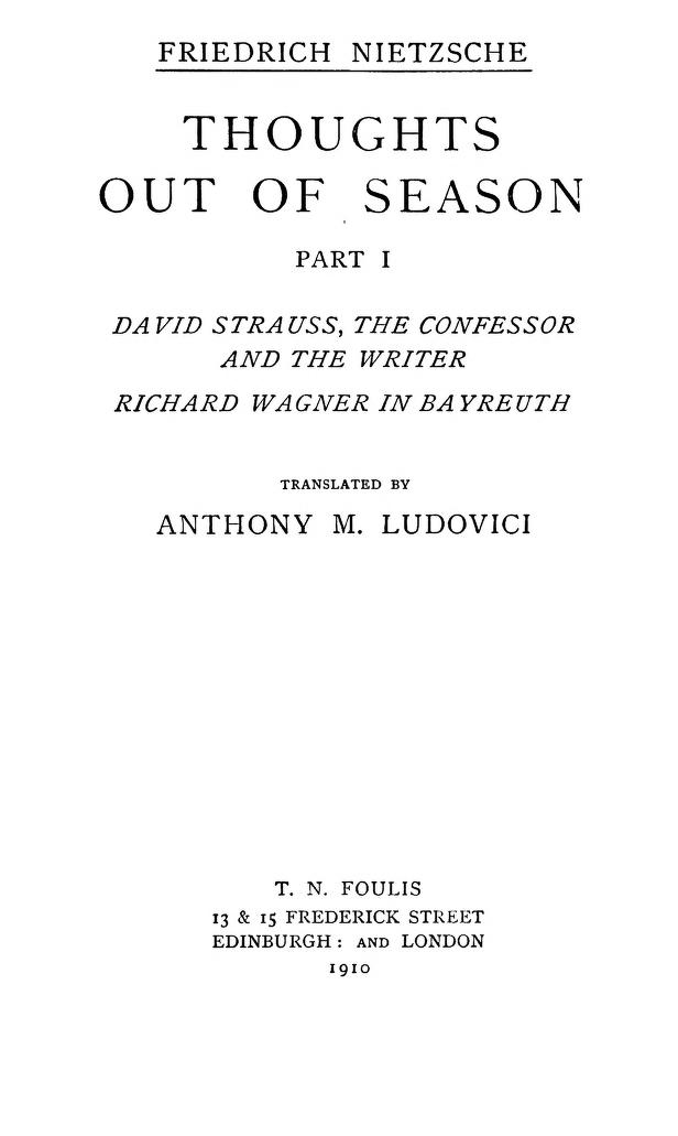 To the reader who knows Nietzsche, who has studied his Zarathustra and understood it, and who, in addition, has digested the works entitled Beyond Good and Evil, The Genealogy of Morals, The Twilight of the Idols, and The Antichrist,—to such a reader everything in this volume will be perfectly clear and comprehensible. In the attack on Strauss he will immediately detect the germ of the whole of Nietzsche's subsequent attitude towards too hasty contentment and the foolish beatitude of the "easily pleased"; in the paper on Wagner he will recognise Nietzsche the indefatigable borer, miner and underminer, seeking to define his ideals, striving after self-knowledge above all, and availing himself of any contemporary approximation to his ideal man, in order to press it forward as the incarnation of his thoughts. Wagner the reformer of mankind! Wagner the dithyrambic dramatist!—The reader who knows Nietzsche will not be misled by these expressions.