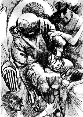 Two men, taller than his friend, came out of the building carrying a plank. They loaded Regan onto it and carried him stretcher-fashion into the building. The friend tagged along behind.