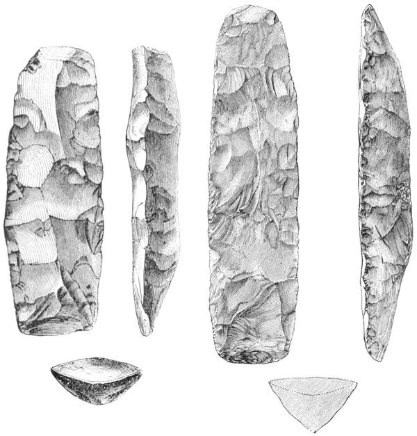 From different Countries — Some Trimmed Flakes, probably Knives — Knives from Barrows — Some possibly Lance-heads — Knives with one Edge blunt — Of Oval Form — Sharpened by Grinding — Of Circular Form — Of Semicircular and Triangular Form — The so-called “Picts’ Knives” — Like those of the Eskimos — Daggers or Lance-heads — With Notches at the Sides — Found in other Countries — Curved and Crescent-shaped Blades — Curved Knives, probably Sickles — Ripple-marked Egyptian Blades . . . 326