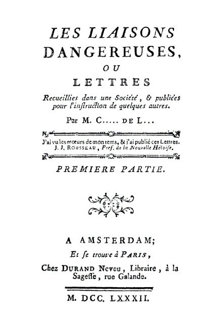 «28 mai 1782.—Les Liaisons dangereuses ou Lettres recueillies dans une société et publiées pour l’instruction de quelques autres, par M. C... de L...