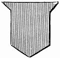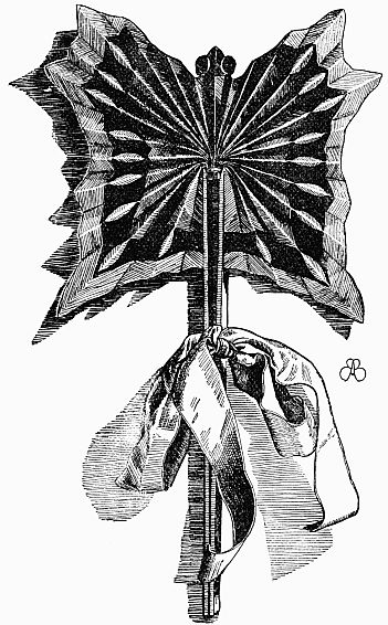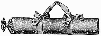 Make Cupid’s bow and arrow of heavy pasteboard, like Fig. 379. Let the bow measure about sixteen inches from tip to tip. Make the arrow twelve inches long, with a point or head three inches, and the feathers two inches, in length on the outside edge. Cut a notch in the feathered end, as shown in Fig. 380.[467] Strengthen the arrow by gluing a thin stick of wood along it to within one inch of the point. Gild both the bow and arrow, tie a silk cord to the tips of the bow, leaving it slack, and force the head of a worsted-needle into the point of the arrow (Fig. 381). Adjust the arrow by fitting the cord in the notch and pulling it back until the cord is taut; then fasten it to the bow by taking a few stitches with yellow silk through the bow and over the arrow. Fig. 382 shows how it should appear when in place.