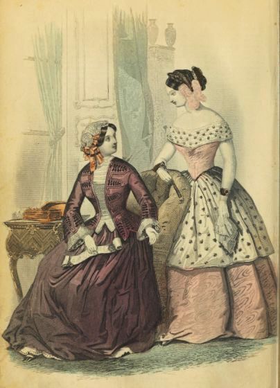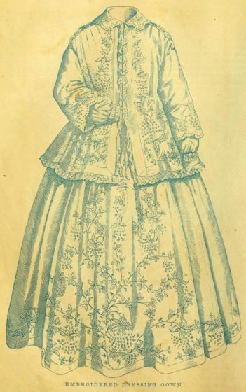 "Very little trimming suffices for mourning; indeed, the very intention of the dress would be lost if much were used. We know this is often the case; but it is sanctioned neither by taste nor economy. We have even seen ruffled bombazines. We object to them decidedly. Folds, by general consent, seem to be the most appropriate style; in the first place, from the thickness of the material generally in use, and again, from the plainness of the effect which is generally required. Broad flat galloons have also been the style the present year; but that is only a transient shade of fashion.