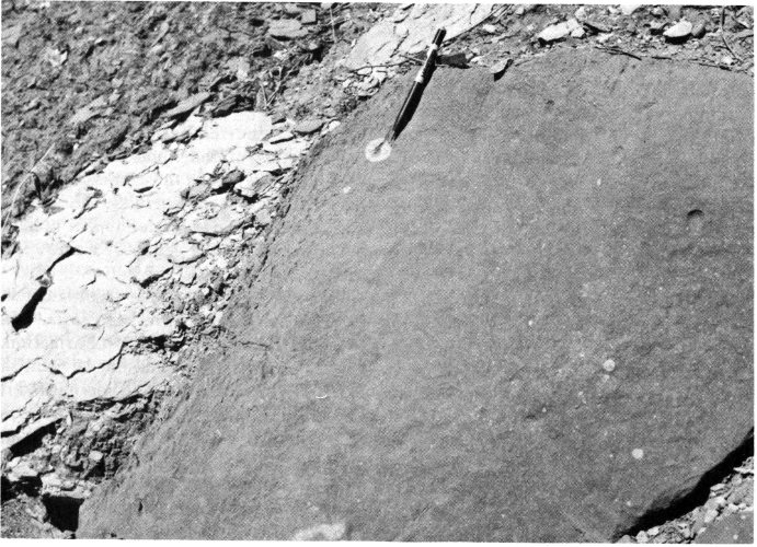 Fig. 10. Chemical reactions in certain of the red Quartermaster shales have produced reduction halos (p. 19) which give the rocks a polka-dot appearance.
