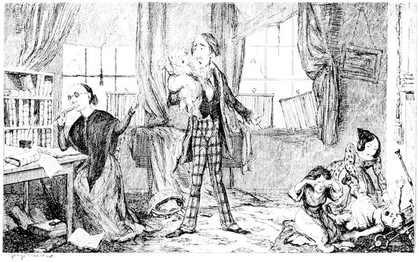 Mrs. Piper (superintending the chops and neglecting her punctuation)—"Oh dear, dear, dear! it's enough to drive anybody crazy with all the trouble I've had with the huzzies the nasty good-for-nothing, idle, lazy—the wicked presumptuous bad creatures, to think of their taking such a start. Don't talk to me, Piper; it's the fault of you men for taking their part. Can't blame them indeed for wanting to better their situations!—of course my servants were very ill used I understand your insinuations. No doubt it's a treat to you to see your poor wife made into a slave—not that there's any novelty in that I wish I was in my grave!—melted to death and getting into such a mess with the chances I have of even getting a new dress—at those dratted chops for you to guzzle. If you had the feelings of a man, you'd do something to help me. Oh! I daresay you're doing all you can—a pretty kettle of fish you're making of the Irish stew. Ah! there goes the poker on to the plates—don't tell me—you do it on purpose—you do. I didn't say you touched the poker but you do all you can to flurry me in one way or other—Tom, you naughty, unfeeling boy, how dare you join in the conspiracy against your poor mother? If your father's burnt you, it's just like him go and rub your hand with soap—though you'll be clever to find it—Yes—Mr. Piper, you're satisfied now, I hope—with your institutions and lectures and South Australia panoramas I wish Mr. Prout and all the rest of the wretches at the Polytechnic were pounded to death with sledge-hammers—putting notions of emigration into the heads of a set of brazen faces—but they've been a great deal too well treated, or they would not have had time to go to such places; and those newspapers talking about their rights and freedom if they'd minded their work they wouldn't have had time to read 'em. In my poor dear mother's time, no servant could get a place who knew how to read. Ought to be treated like human beings? a pretty story, indeed! I know what you mean Piper you needn't try to keep your gravity—but they were always thinking of husbands and settling in life or some such depravity.