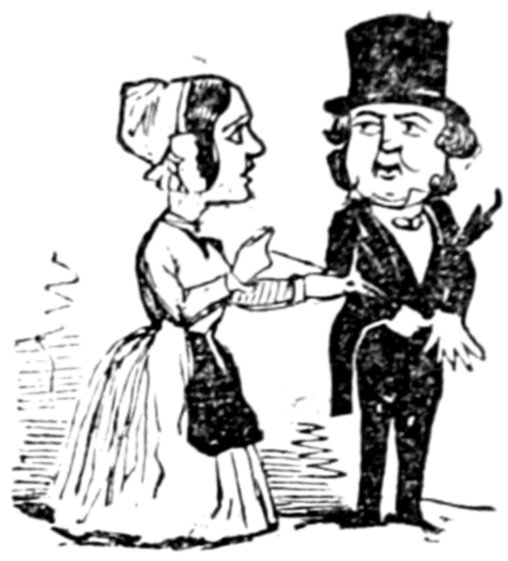 Ladies, then, angels, goddesses ("Oh!" from an elderly bachelor, who was removed by the police), for the thrilling position in which I am placed, how can I be sufficiently grateful to that glorious reform in our electoral system, which has partially recognised the true position of lovely woman? ("Partially!" in a tone of sarcasm, from a member of Mr. Screwdriver's committee). My honourable and gallant friend objects to the adverb. I say partially, for by admitting the ladies to the Franchise with the gentlemen, they are but recognised as equals, instead of superiors. (Great sensation.) Yes, ladies, and it shall be my earnest endeavours as your representative ("Yah!" and "Not yet!" from Mr. Screwdriver). My honourable and gallant friend observes "Not yet." It is true I have a formidable rival to contend with. The charms of his person, (screams, and "the Old Fright!") his known politeness, above all his taste in dress (here the laughter and clapping of kid gloves rendered the speaker inaudible for some moments)—compared with such claims, mine are worthless ("Do listen!" and "The Duck!"), extending no farther than a willingness, I may say a downright anxiety, to die in the cause of the fair creatures, who, I believe I may say, have done me the honour to elect me as their champion ("Yes! Yes!") With the ladies' voices in my favour, I believe I need not fear those of the gentlemen being exerted against me. (Cries of "We should like to see them," "Speak up, Alfred, do," "I'm ashamed of you," &c.) I thank you, gentlemen—or rather I do not thank you; I honour you for your—may I say obedience? ("Oh yes!" in a rapturous tone, from the engaged gentlemen), though, after all, I don't see how you were to help yourselves. (Great applause, and numerous bouquets thrown.)
