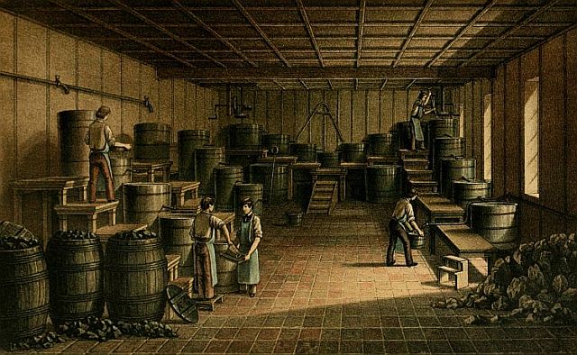 The first plate represents the sluicing process. On the left hand side of the picture the blacklead is seen in its original casks, on the right hand side the clay. These two raw materials are here washed and then passed on in pans to be dried.