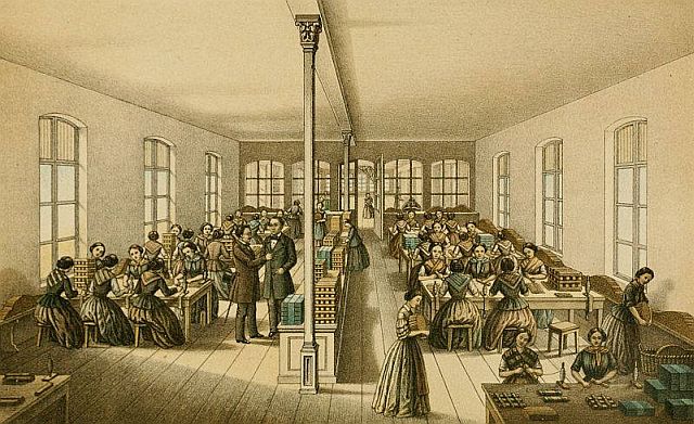 In the seventh plate to the right the workwomen are seen engaged in polishing the pencils with colours, and to the left those who by means of a lever press stamp the name of the firm upon them.