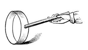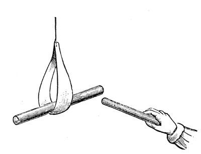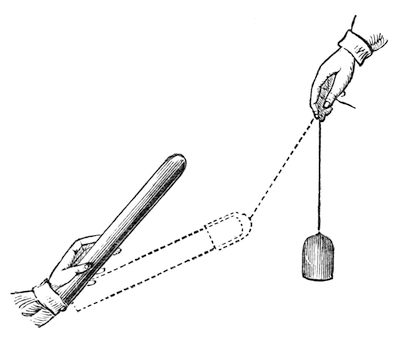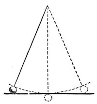 Let me now give you another illustration of this power. You know what a pendulum is. I have one here (fig. 1), and if I set it swinging, it will continue to swing to and fro. Now, I wonder whether you can tell me why that body oscillates to and fro—that pendulum bob as it is sometimes called. Observe, if I hold the straight stick horizontally, as high as the position of the balls at the two ends of its journey26 you see that the ball is in a higher position at the two extremities than it is when in the middle. Starting from one end of the stick, the ball falls towards the centre; and then rising again to the opposite end, it constantly tries to fall to the lowest point, swinging and vibrating most beautifully, and with wonderful properties in other respects—the time of its vibration, and so on—but concerning which we will not now trouble ourselves.