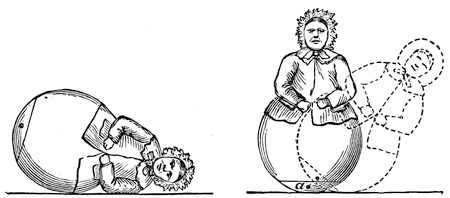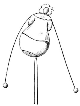 Here is a toy I happened to see the other day, which will, I think, serve to illustrate our subject very well. That toy ought to lie something in this manner (fig. 5); and would do so if it were uniform in substance. But you34 see it does not; it will get up again. And now philosophy comes to our aid; and I am perfectly sure, without looking inside the figure, that there is some arrangement by which the centre of gravity is at the lowest point when the image is standing upright; and we may be certain, when I am tilting it over (see fig. 6), that I am lifting up the centre of gravity (a), and raising it from the earth. All this is effected by putting a piece of lead inside the lower part of the image, and making the base of large curvature; and there you have the whole secret. But what will happen if I try to make the figure stand upon a sharp point? You observe, I must get that point exactly under the centre of gravity, or it will fall over thus [endeavouring unsuccessfully to balance it]; and this you see35 is a difficult matter—I cannot make it stand steadily. But if I embarrass this poor old lady with a world of trouble, and hang this wire with bullets at each end about her neck, it is very evident that, owing to there being those balls of lead hanging down on either side, in addition to the lead inside, I have lowered the centre of gravity, and now she will stand upon this point (fig. 7); and what is more, she proves the truth of our philosophy by standing sideways.