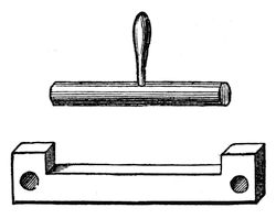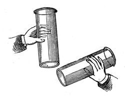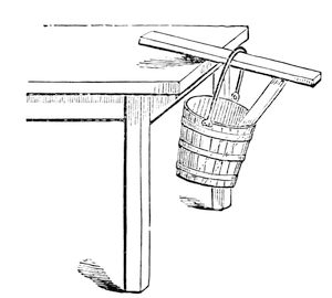 I remember an experiment which puzzled36 me very much when a boy. I read it in a conjuring book, and this was how the problem was put to us: “How,” as the book said, “how to hang a pail of water, by means of a stick, upon the side of a table” (fig. 8). Now, I have here a table, a piece of stick, and a pail, and the proposition is, how can that pail be hung to the edge of this table? It is to be done; and can you at all anticipate what arrangement I shall make to enable me to succeed? Why, this. I take a stick, and put it in the pail between the bottom and the horizontal piece of wood, and thus give it a stiff handle—and there it is; and what37 is more, the more water I put into the pail the better it will hang. It is very true that before I quite succeeded I had the misfortune to push the bottoms of several pails out; but here it is hanging firmly (fig. 9), and you now see how you can hang up the pail in the way which the conjuring books require.