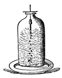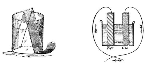 I want you to understand that this property of gravitation is never lost, that every substance possesses it, that there is never any change in the quantity of it; and, first of all, I will take as illustration a piece of marble. Now this marble has weight—as you will see if I put it in these scales; it weighs the balance down, and if I take it off, the balance goes back again and resumes its equilibrium. I can decompose this marble and change it, in the same manner as I can change ice into water and water into steam. I can convert a part of it into its own steam easily, and shew you that this steam from29 the marble has the property of remaining in the same place at common temperatures, which water-steam has not. If I add a little liquid to the marble, and decompose it6, I get that which you see—[the Lecturer here put several lumps of marble into a glass jar, and poured water and then acid over them; the carbonic acid immediately commenced to escape with considerable effervescence]—the appearance of boiling, which is only the separation of one part of the marble from another. Now this [marble] steam, and that [water] steam, and all other steams gravitate, just like any other substance does—they all are attracted the one towards the other, and all fall towards the earth; and what30 I want you to see is, that this steam gravitates. I have here (fig. 2) a large vessel placed upon a balance, and the moment I pour this steam into it, you see that the steam gravitates. Just watch the index, and see whether it tilts over or not. [The Lecturer here poured the carbonic acid out of the glass in which it was being generated into the vessel suspended on the balance, when the gravitation of the carbonic acid was at once apparent.] Look how it is going down. How pretty that is! I poured nothing in but the invisible steam, or vapour, or gas which came from the marble, but you see that part of the marble, although it has taken the shape of air, still gravitates as it did before. Now, will it weigh down that bit of paper? [Placing a piece of paper in the opposite scale.] Yes, more than that; it nearly weighs down this bit of paper. [Placing another piece of paper in.] And thus you see that other forms of matter besides solids and liquids tend to fall to the earth; and, therefore, you will accept from me the fact—that all things gravitate, whatever may be their form or condition. Now here is another chemical test which is very31 readily applied. [Some of the carbonic acid was poured from one vessel into another, and its presence in the latter shewn by introducing into it a lighted taper, which was immediately extinguished.] You see from this result also that it gravitates. All these experiments shew you that, tried by the balance, tried by pouring like water from one vessel to another, this steam, or vapour, or gas, is, like all other things, attracted to the earth.