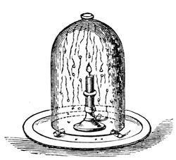 I want you now to understand the nature of the most simple exertion of this power of matter called weight, or gravity. Bodies are heavy—you saw that in the case of water when I placed it in the balance. Here I have what we call a weight [an iron half cwt.]—a thing called a weight, because in it the exercise of that power of pressing downwards is especially used for the purposes of weighing; and I have also one of these little inflated india-rubber bladders, which are very beautiful although very common (most beautiful things are common), and I am going to put the weight upon it, to give you a sort of illustration of the downward pressure of the iron, and of the power which the air possesses of resisting that pressure. It may burst, but we must try to avoid that [During the last few observations the Lecturer had succeeded in placing the half cwt. in a state of quiescence upon the inflated india-rubber25 ball, which consequently assumed a shape very much resembling a flat cheese with round edges.] There you see a bubble of air bearing half a hundred weight, and you must conceive for yourselves what a wonderful power there must be to pull this weight downwards, to sink it thus in the ball of air.