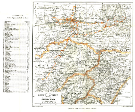 A large foldout map of the South African campaign, with its accompanying legend, was bound inside the end cover. The legend has been removed from that image and is given here in tabular form, which should make it more useful. A full-size version of that map, as well as that on p. 145, can be viewed by clicking on the image.