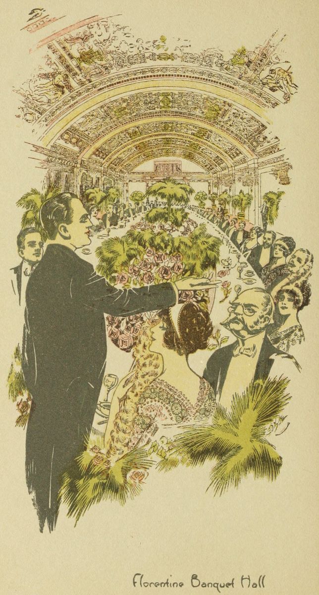 The Grand Dining Room, decorated in the style of Louis XVI is of itself a feature well worthy of detailed description; the German Room—Pomp-Grill Room—than which no hotel in the New World has a more interesting dining room. Upon the walls of the Lobby and in the reception rooms are hung originals from the brushes of such masters as Detaille, Achilles Fould, Grolleron and Chelminski.