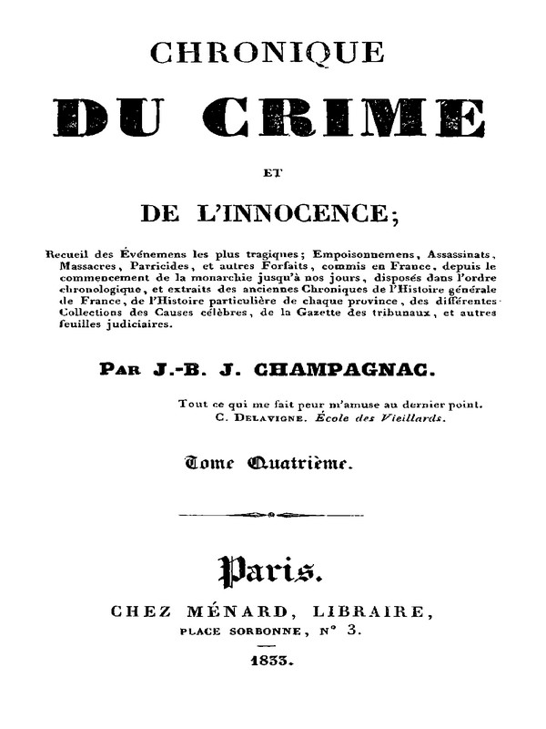 Recueil des Événemens les plus tragiques; Empoisonnemens, Assassinats, Massacres, Parricides, et autres forfaits, commis en France, depuis le commencement de la monarchie jusqu'à nos jours, disposés dans l'ordre chronologique, et extraits des anciennes Chroniques de l'Histoire générale de France, de l'Histoire particulière de chaque province, des différentes Collections des Causes célèbres, de la Gazette des Tribunaux, et autres feuilles judiciaires.