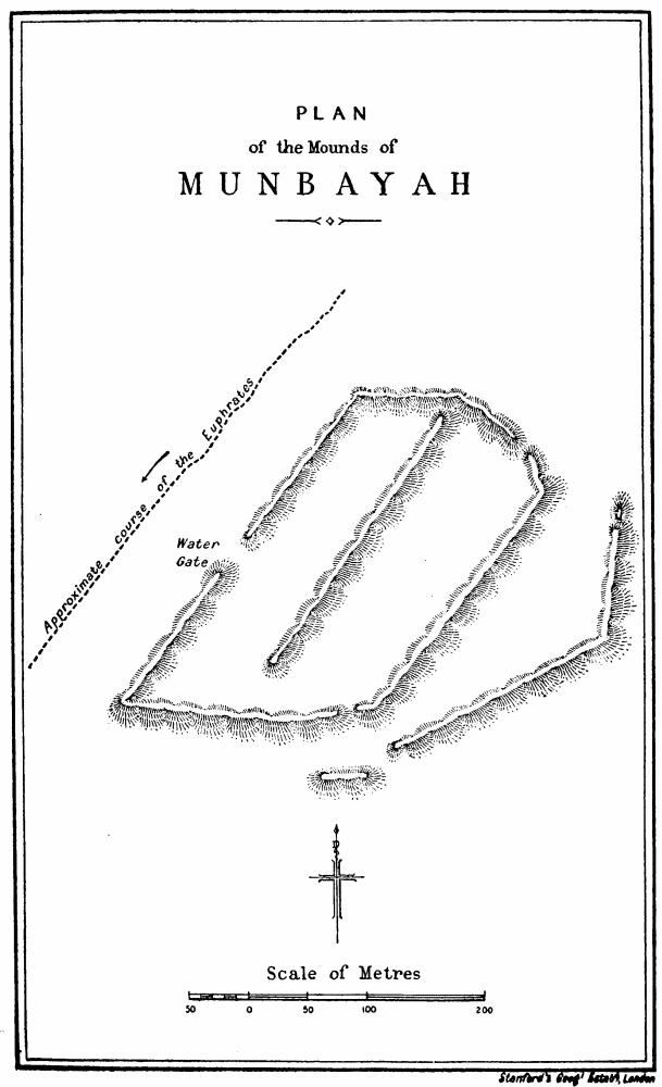 At Aleppo the current of the imagination is tributary to the Euphrates. With Xenophon, with Julian, with all the armies captained by a dream of empire that dashed and broke against the Ancient East, the thoughts go marching down to the river which was the most famous of all frontier lines. So we turned east, and on a warm and misty February morning we passed under the cypresses of Abu Bekr and took the road to Hierapolis. It was a world of mud through which we journeyed, for the rains had been heavy, and occasionally a shower fell across our path; but rain and mud can neither damp nor clog the spirit of those who are once more upon the road, with faces turned towards the east. The corn was beginning to sprout and there were signs too of another crop, that of the locusts which had swarmed across the Euphrates the year before, and after ravaging the fields had laid their eggs in the shallow earth that lies upon the rocky crest of the ridges between cornland and cornland. Whenever the road climbed up to these low eminences we found a family of peasants engaged, in a desultory fashion, in digging out the eggs from among the stones. Where they lay the ground was pitted like a face scourged with smallpox, but for every square yard cleared a square mile was left undisturbed, and{17} the peasants worked for the immediate small reward which the government paid for each load of eggs, and not with any hope of averting the plague that ultimately overwhelmed their crops. It comes and goes, for what reason no man can tell, lasting in a given district over a term of lean years, and disappearing as unaccountably as it came: perhaps a storm of rain kills the larvæ as they are hatching out, perhaps the breeding season is unfavourable—God knows, said Ḥâjj ’Alî, the zaptieh who accompanied me. The country is set thick with villages, of which Kiepert marks not the tenth part—and even those not always rightly placed. We passed his Sheikh Najar, and at Sheikh Ziyâd I went up to see the ziyârah, the little shrine upon the hill-top, but found there nothing but a small chamber containing the usual clay tomb. We left Serbes on the right—it was hidden behind a ridge—and took a track that passed through the village of Shammar. Not infrequently there were old rock-cut cisterns among the fields and round the mounds whereon villages had once stood. At Tell el Ḥâl, five hours from Aleppo, a modern village lies below the mound, and by the roadside I saw part of the shaft of a column, with a moulded base, while several more fragments of columns were set up as tombstones in the graveyard. An hour before we reached Bâb we caught sight of the high minaret of the ziyârah above it. It is a flourishing little place with a bazaar and several khâns, in one of which I lodged. The heavy rain-clouds that had hung about us all day were closing down as evening approached, but I had time to climb the steep hill to the west of the village, where a cluster of houses surrounds the ziyârah of Nebî Ḥâshil—so I heard the name, but Abu’l Fidâ calls it the Mashhad of ’Aḳil ibn Abî Ṭâlib, brother of the Khalif ’Alî[4]—an old shrine of which the lower part of the walls is built of rusticated stones. The tomb itself was closed, but I went to the top of the minaret and had a fine view of the shallow fruitful valley of the Deheb, which, taking its source near Bâb and the more northerly Tell Batnân, runs down to the salt marshes at the foot of Jebel{18} el Ḥaṣṣ. Across the valley there is a notable big mound with a village at its foot, the Buzâ’â of the Arab geographers, “smaller than a town and larger than a village,” said Ibn Jubeir in the twelfth century. The ancient Bathnæ where Julian rested under “a pleasant grove of cypress trees” is represented by Buzâ’â and its “gate” Bâb. He compares its gardens with those of Daphne, the famous sanctuary of Apollo near Antioch, and though the gardens and cypresses have been replaced by cornfields, it is still regarded by the inhabitants of Aleppo as an agreeable and healthy resort during the hot months of summer. Perhaps we may carry back its history yet earlier and look here for the palace of Belesys, the Persian governor of Syria, at the source of the river Dardes, which Xenophon describes as having “a large and beautiful garden containing all that the seasons produce.”[5] Cyrus laid it waste and burned the palace, after which he marched three days to Thapsacus on the Euphrates; but the Arab geographers place Bâlis (which some have conjectured to have occupied the site of the Persian palace) two days from Aleppo, and the position of Thapsacus has not been determined with any certainty. If it stood at Dibseh, as Moritz surmises,[6] Cyrus could well have reached it in three marches from Bâb, and I am inclined to think that Xenophon’s account identifies the satrap’s pleasaunce with the garden of Bathnæ. In Kiepert’s map the relative distances between Aleppo and Bâb and Bâb and Manbij are not correct. I rode the two stages in almost exactly the same time (seven and a quarter hours), and the caravan took nine hours each day, whereas the map would have the march to Manbij a good two hours longer than the march to Bâb.[7]