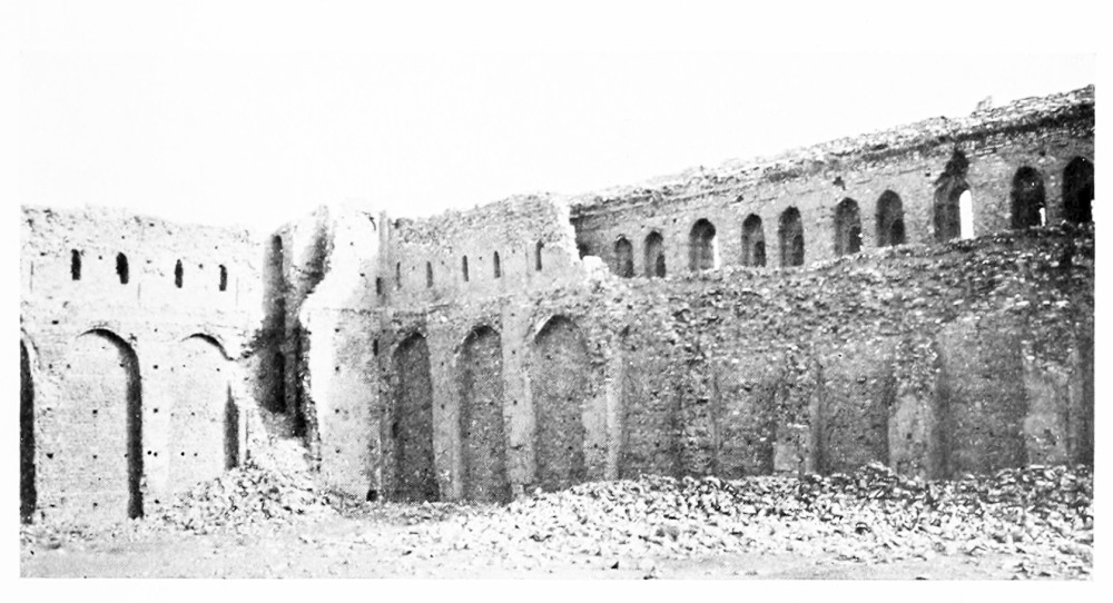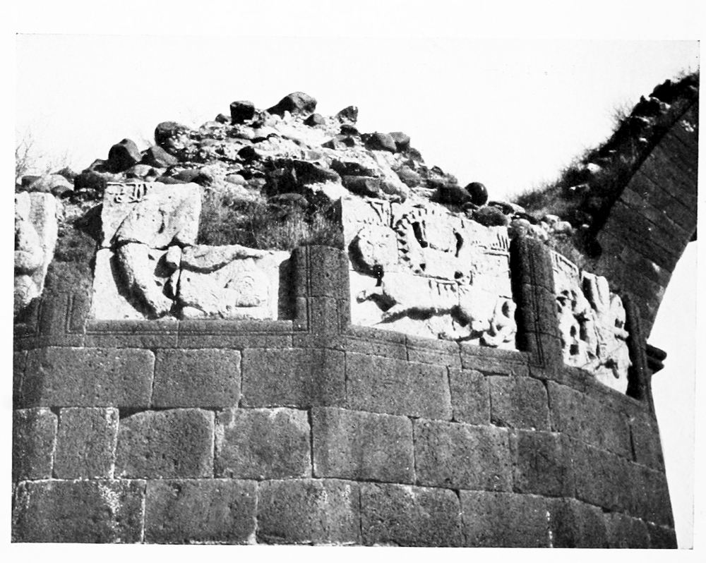 [231] In the low ground there are remains of a theatre, a fine bit of stone wall decorated with good mouldings, and part of a vaulted brick building, possibly a gymnasium. All these are upon the left bank of the stream. The temple upon the bluff was converted at an early date into a church, which has long since fallen into decay, though it has been patched up in recent times by the Armenians (Fig. 228). Along the edge of the bluff there are remains of a columned portico. In the ruined bazaar I saw a couple of beautiful funnel capitals, cracked and broken by fire. They should probably be dated in the early sixth century. At the entrance of the valley that leads up to the Kara Bel are the ruins of a small temple with a finely carved doorway (Fig. 223).